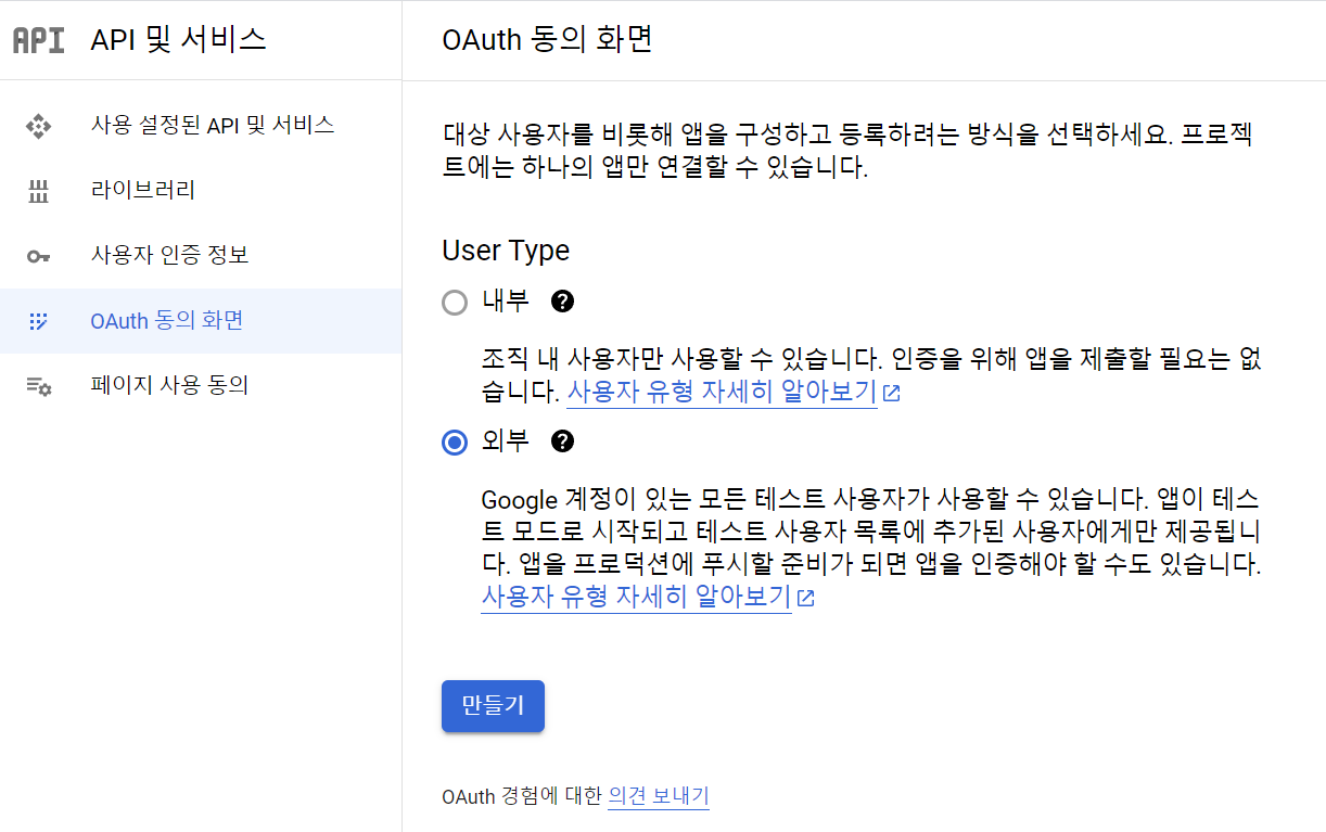 2. OAuth 동의화면 구성
