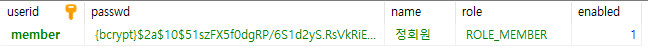 INSERT INTO Member VALUES('member', '12345678', '회원', 'ROLE_MEMBER', 1);